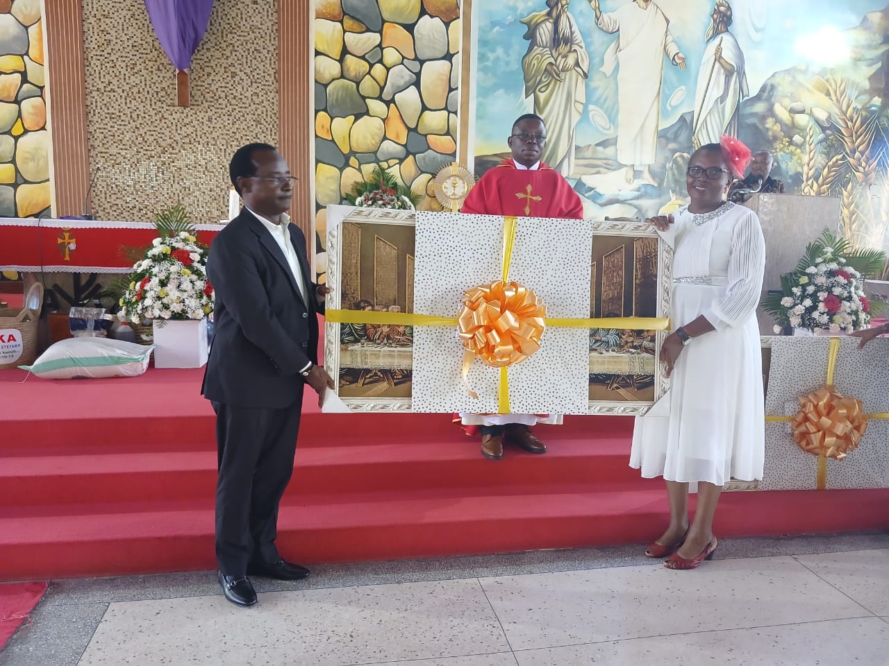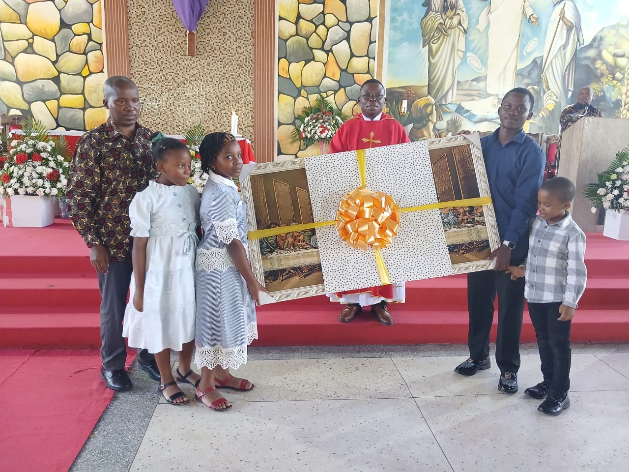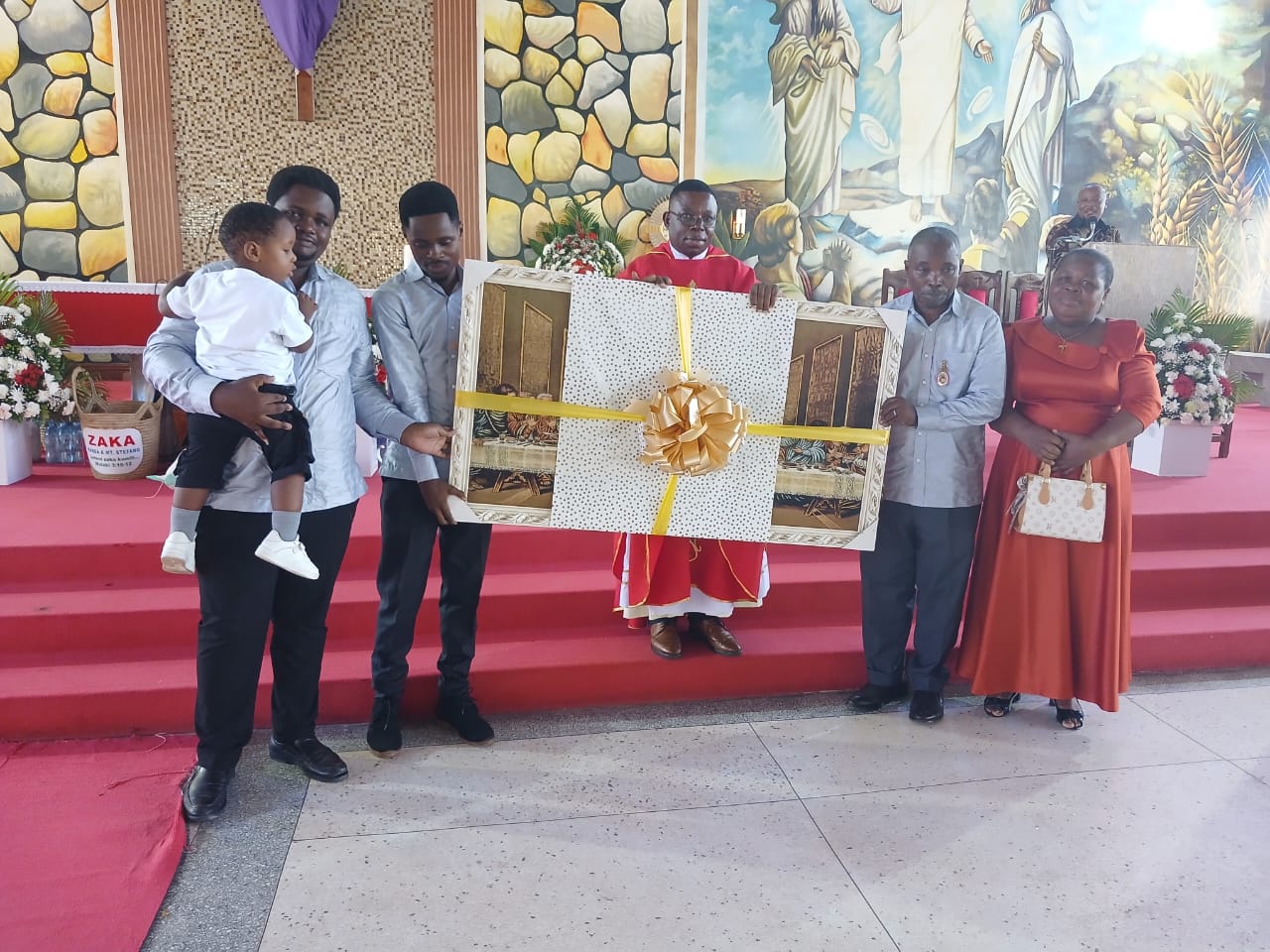 Paroko akikabidhi zawadi kwa familia ya aliyekuwa Mwenyekiti wa Kwanza wa Parokia Eng. Theophil Mfala