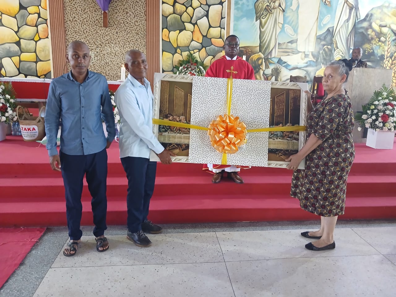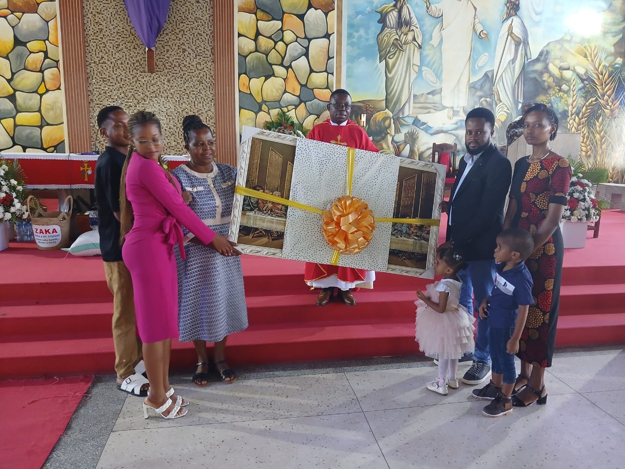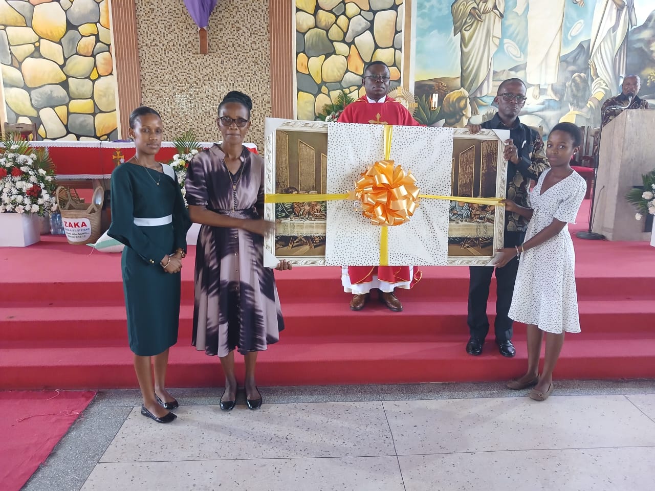 Paroko akikabidhi zawadi kwa familia ya aliyekuwa Mwenyekiti wa Kwanza wa Parokia Eng. Theophil Mfala